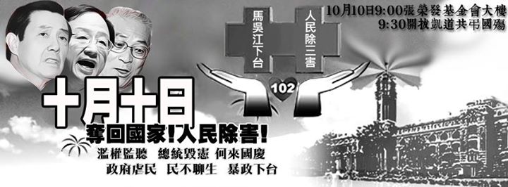 馬英九無能陰險自私狡詐,已經到了舉國唾棄的程度,十月十日在凱達格蘭大道舉行的雙十慶典,現場群眾雲集,電視也有轉播,正是表達人民不滿,要求馬政府全面下台的最佳場合。