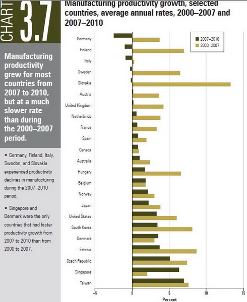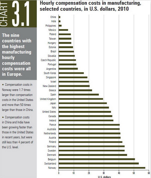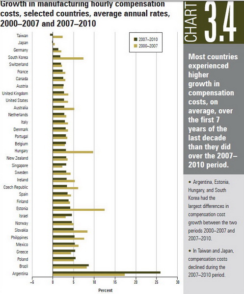 表1到表3(見文末)是美國勞工部(U.S. Department of Labor)國際勞工比較表2012版(Charting International Labor Comparisons 2012 Edition)的統計資料。表1是勞工每小時工作補償成本(薪資+福利+獎金+保險等等),台灣名列倒數第6名。表2是勞工的生產力資料,2000-2007年,台灣勞工表現居前茅;2007-2010年雖然表現稍退,但台灣勞工生產力卻排名所有國家的第一。表3是勞工每小時工作補償成本成長率,2000-2007年成長幅度普通,但2007年以後卻是負成長。2007年以後的薪資等補償成本成長率,僅日本與台灣負成長,日本是微幅負成長,台灣的負成長卻是日本的數倍,慘況驚人。