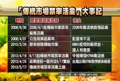 此次「禁宰活禽」的雷厲風行,主要是農委會看準H7N9禽流感尾隨中國台商入台之「天賜良機」,強勢宣布傳統市場「禁宰活禽」(以土雞屠宰為主)政策將提前至5月17日實施。但早在2006年,農委會即曾希冀推出「禁宰」政策以禁絕禽流感。事實上,「禁宰活禽」政策是以衛生屠宰、低溫運輸與雞隻品牌建立等目標為理據,但由於,此政策有利於大型業者,對傳統現宰活禽業者卻可能產生衝擊,以致爭議四起而延宕多年。