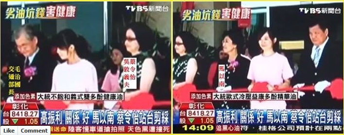 現在大統食用油品的問題震驚台灣社會,不僅一般家庭、餐飲業、軍方,連學校都中彈倒地。如今,新加坡繼5月禁止台灣澱粉相關產品進口後,又宣布禁止台灣食用油的進口。事實上,早在一年前,衛生署(現衛生福利部)就知道大統油品有問題,但衛生福利部卻遲遲沒有任何措施。一年沒作為,這所為何來呢?近來,一張總統馬英九姊姊馬以南、副總統吳敦義夫人蔡令怡與大統老闆高振利的合照,是否訴說著一段不可告人的故事呢?