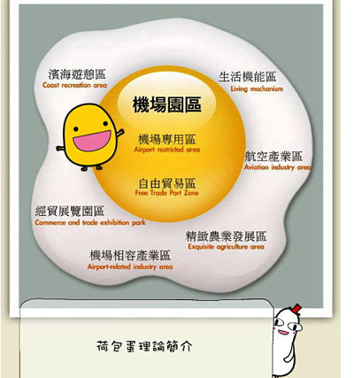 這麼大的一個荷包蛋開發案(總面積高達4700公頃),然而荷包蛋裡面有什麼內容呢?主要桃園機場新增一條第三跑道,阿?一條跑道需要4700公頃的土地?當然不只,根據政府的「荷包蛋理論」,此案乃「愛台十二大建設之一」,包括大桃園的都市計畫、自由經濟貿易港區和「觀光賭場」。超譯成為白話文,就是「趁泡沫化前擴大炒房」、「有錢人避稅及免勞基法專區」和「桃園經濟只剩下賭場」這三大計畫,可以說幫桃園人從土地被徵收後、變成勞工被剝削,到產業泡沫後到賭場打工等,所有生涯規劃都打包成一條龍服務。就像小鴨被干爆之後還是可以到隔壁攤位跟模型拍照,或者跟高雄借鴨子來過過乾癮一樣。