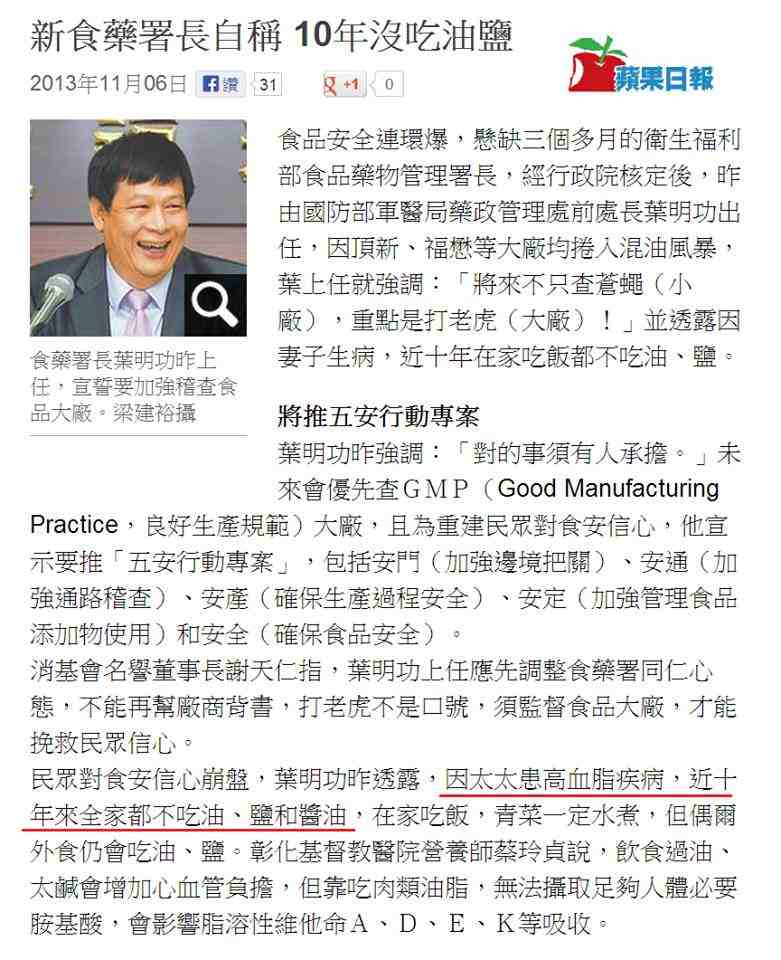 你有沒有什麼東西不吃?不是為了口味與偏好,比如美食節目大口吃台灣裡的日本主持人阿松那句招牌吩咐「不要香菜」,也不是為了宗教或民俗理由,比如不少台灣長輩不吃牛肉,而是為了養生保健,怕三高怕傷肝傷腎怕罹癌而刻意忌口。新上任的食品藥物管理署長葉明功就是這樣一個人。媒體報導,他因為妻子罹患高血脂疾病,近十年來在家吃飯都不吃油,鹽和醬油。