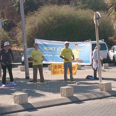 26日,安息日,特拉維夫的海岸上,充滿陽光、沙灘、比基尼,搭配25度溫暖適中好的氣溫,我漫步到已有3000千年歷史的雅法古城邊,望著地中海。這是一個沒有政治、沒有嚴肅消息的一天。但我錯了。在五十公尺外,我就撇見一幅熟悉的布條,布條上印著熟悉的人像:李洪志!布條中寫著我看不懂的希伯來文。布條下方,還貼著「法輪大法好」的中文字樣。我當下噗哧一笑:「法輪功竟然也把此地攻佔了」。「但這裡沒有中國遊客啊!」我轉過頭看看四周,只有金髮碧眼的老外們,把腳踏車丟在一旁,拿著相機,照著他們。但這幾個以色列老人(這是我第一次看到老外在練法輪功)仍不畏他人眼光(以色列人本來就很自我,不太關心別人怎麼看),專心地練功。