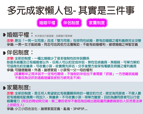 含括同性婚姻、伴侶制度與多人家屬制度的「多元成家」法案,在網路引起各種正反兩造的連署對壘。持異見者的藝人,受到支持多元成家的網友鄉民攻訐,於是便有人以自詡多元與包容性大的台灣,不該圍剿持異見的藝人云云。