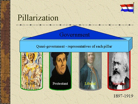 事實上,1960年代荷蘭社會的世俗化指涉兩個層面:除了是一般所謂虔誠宗教人口,因受到世俗價值影響而降低之外,同時也指涉國家治理運作時的一般價值,逐漸穿透這些各自為政的「柱子」社群。例如,以小兒麻痺疫苗全面施打為表現的國家衛生人口的普遍性政策,最終還是鬆動滲入了此些柱子社群之中。