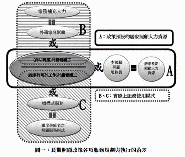 馬英九曾於2008年提出「四年內完成長照保險立法」政見,至今長照保險仍無下落,而2011年的「長照服務法」草案,也未將家庭照顧者及家務移工納入其中。事實上,現有的長照內容例如照顧服務、喘息服務以及送餐等等,由於服務請領的設計以及相關政策配套不足,所以縱使在長照服務法當中畫了長照機構和本籍服務人力的大餅,大多數人還是會選擇現行能夠選擇的照顧方式,頂多就是領一份現金給付,而不會去用「難用」的長照服務。