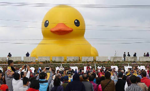 一隻充氣的黃色巨鴨在一灘水上,不是件看起來這麼簡單的事。因為各地的人們都非常一窩風,它將在短期內產生龐大的觀光人潮與攤販商家,它將考驗主辦單位對交通、紓散、動線的能力。它也將因為氣候變化而出現許多變數,好比在小鴨在桃園時,疑似地震與強風的幾度洩氣,這在香港維多利亞港也曾發生過。