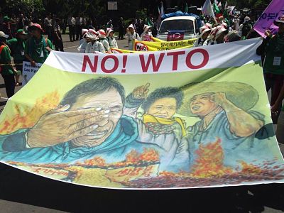 說到WTO的抗議,大家腦海浮現的畫面也許是1999年在美國西雅圖,滿街象徵自由貿易商店玻璃被抗議人士砸毀,還有警方的煙霧彈、鎮「暴」噴水車等等;又或是 2005年的香港,人民跳海、絕食抗議,警方用催淚彈、胡椒水來驅趕民眾等等。