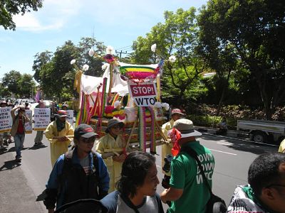 當然,這樣的旁聽引起各國人民代表的不滿,於是大家便集思廣益,打算用印尼的傳統葬禮為WTO舉行送葬,希望能END WTO,同時也是為了悼念在2003年墨西哥坎昆自殺抗議WTO的韓農—─李京海。