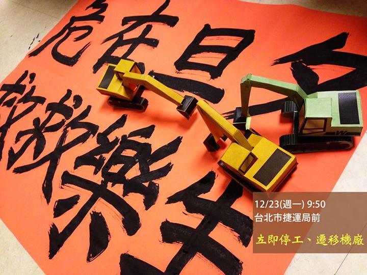 下週一(12/23)早上9:50,我們將回到捷運局,以行動劇的方式,把毀壞樂生的怪手還給捷運局!我們要求捷運局立即停工、土方回填、遷移機廠!捷運局莫再繼續施工、罔顧人命,如果發生事故,捷運局將難辭其咎!