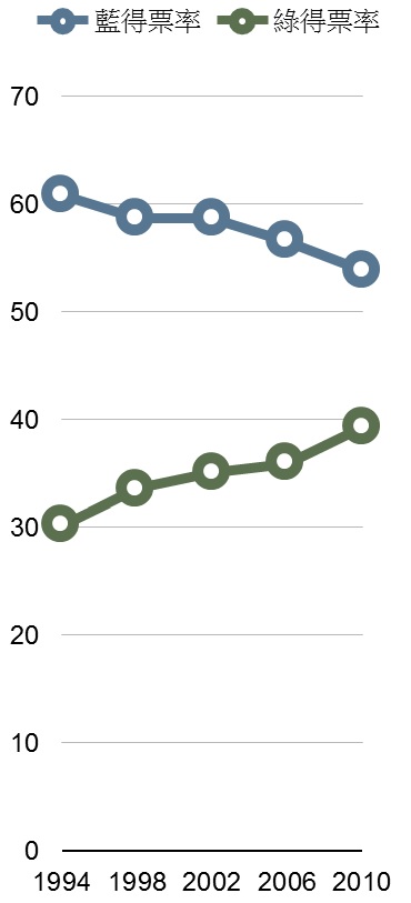 從北市議員得票率看起來,台北市藍大於綠的確仍然是基本結構;但是,雙方走勢是綠上藍下,基本盤強弱態勢雖然沒變,但是10多年來差距已經從30.8%縮小到14.5%。