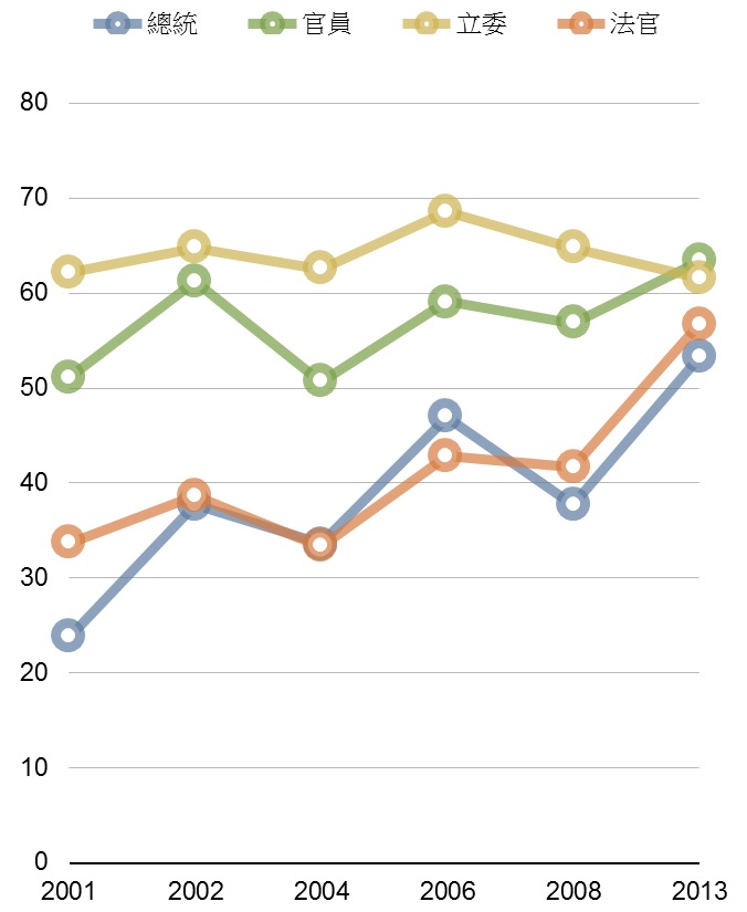 依據群我倫理促進會的調查,在2001年雖然對立委的不信任度高達6成2,對官員不信任度也有5成2,但對總統、法官的不信任度都才在2成多3成,但是到了從2013民眾對他們的不信任度,全部上升到5成多甚至6成多。這表示的是民眾對總體代議體制的全盤不信任。看了這個調查表現出來的驚人趨勢後我們就不會再驚訝為什麼自衫軍對想參一腳的政界人士那麼不留顏面了;當然也不必對外星人和幽靈在台北市民調遙遙領先而意外了;同時,柯文哲的說他的支持有8成反對他加入政黨也就是自然不過的了。