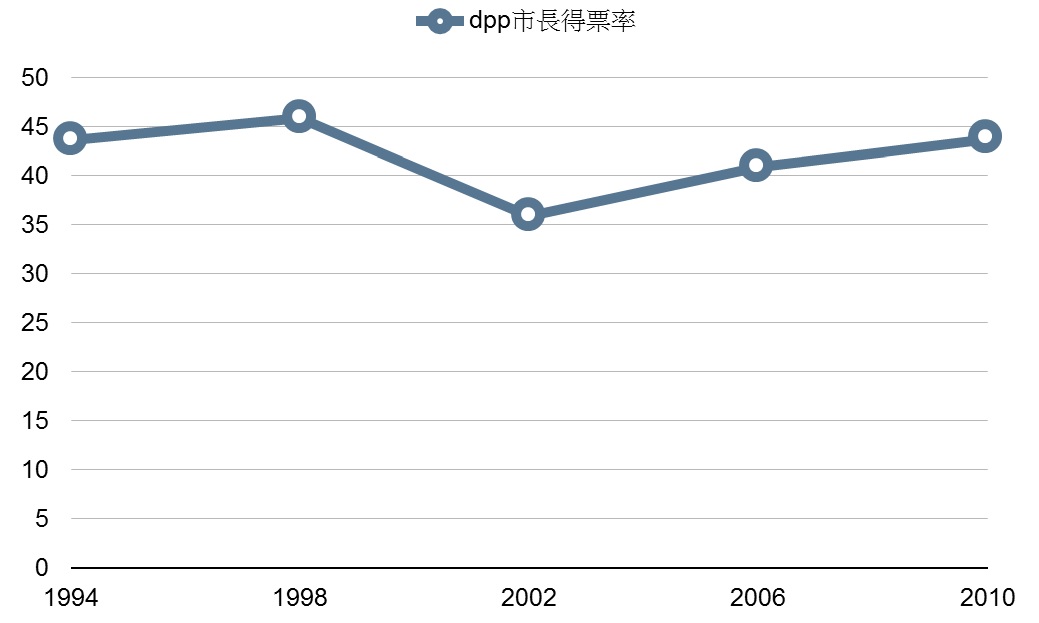 看到這幅民進黨北市市長得票率浮沈圖,免不了要說天龍國真的愈來愈天龍了,綠的基本盤愈縮愈小了。不過結論不必下得這樣悲觀。市長得票率的高低固然得以所謂的基本盤做基礎,但是候選人的魅力也是同樣關鍵,市長選票不是基本盤最好的指標。1994,1998民進黨得票率高,陳水扁當時的魅力影響很大。至於真正的基本盤,從多席次的市議員的加總才更能顯示出來: