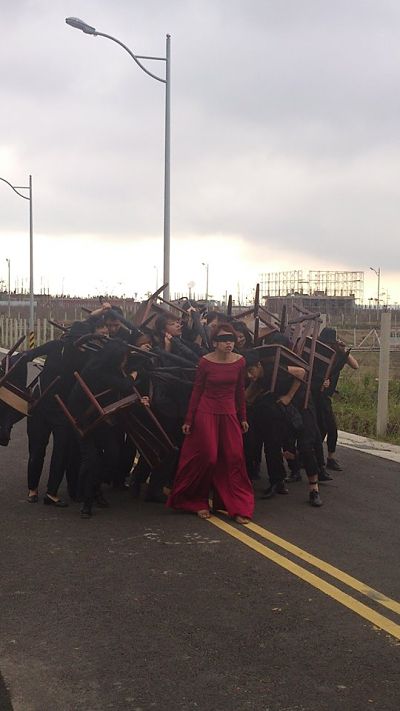 這個週末,蕭紫菡舞蹈劇場土地計劃來到了苗栗竹南大埔。蕭紫菡帶領著非舞蹈科班出身的舞者,為大埔祈福。身著漆黑褲裝的舞者在仁愛路上一路排開,莊嚴肅穆,蓄勢待發。一旁,黑衣男子緩緩走向掛著鮮花的張藥房遺址,抬頭望了望,戴起黑帽,加入漆黑的行列,張牙舞爪。沒錯,如同舞劇所呈現的張力,苗栗縣政府以及財團正在大埔這片土地上張開他的爪牙。