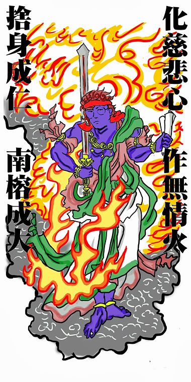 在日本的真言宗裏,有位渾身被烈火包圍,手執金鋼劍和法索的不動明王。以憤怒相示人的不動明王,其「不動」兩字代表對佛法的堅信和不退轉。而以憤怒相降魔除惡的不動明王,正是以慈悲為本懷的大日如來化身。為了破除眾生迷妄、為了守護正法,原本慈眉善目愛好和平的佛法本尊,才會成為了怒目勇猛的不動明王。
