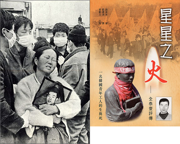 以韓國為例,當亞洲各國的工運積弱不振之時,韓國勞工運動的強悍與強韌,幾乎可說是一枝獨秀。根據韓裔美籍學者具海根(Hagen Koo)的研究,1970年11月13日,一名年僅22歲的裁縫工全泰壹,在一場替深受剝削的韓國服裝業工人的抗議場合上,將汽油往身上潑灑並點燃,用最極端激烈的方式,向這個體制發出最後的怒吼。此舉,震懾了在場以及不在場的所有韓國人民。
