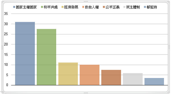 今年6月為了召開華山會議,民進黨列舉了國家主權國家,和平共處,經濟發展,自由人權,公平正義,民主體制,都堅持7項價值選項做了一份「兩岸交流中最應該堅持的價值」調查,發現民眾認為最該堅持是國家主權國家,和平共處,經濟發展三項,都超過10%以上。
