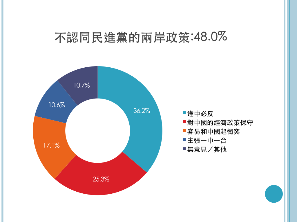 根據上圖,我們發現民進黨最被不喜歡的是「逢中必反」;至於台獨呢?雖然也是原因,但是只佔不喜歡民進黨的48.0%中的10.7%。也就是佔總人口48.0%x10.7%=5.13%。