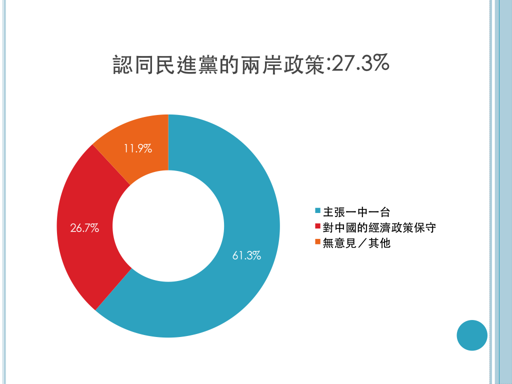 依據這數據看來,國民黨正因為跟共產黨建立關係太好了,所以在引起社會的反感,所以民進黨的凍獨人士以為民進黨就是不能夠像國民黨一樣跟共產黨建立關係,以致於不被社會支持,所以民進黨應該利用自己和共産間沒有像國民黨一樣的歷史恩怨的機會,和共産黨建立比國民黨更好的關係的主張實在大有問題。