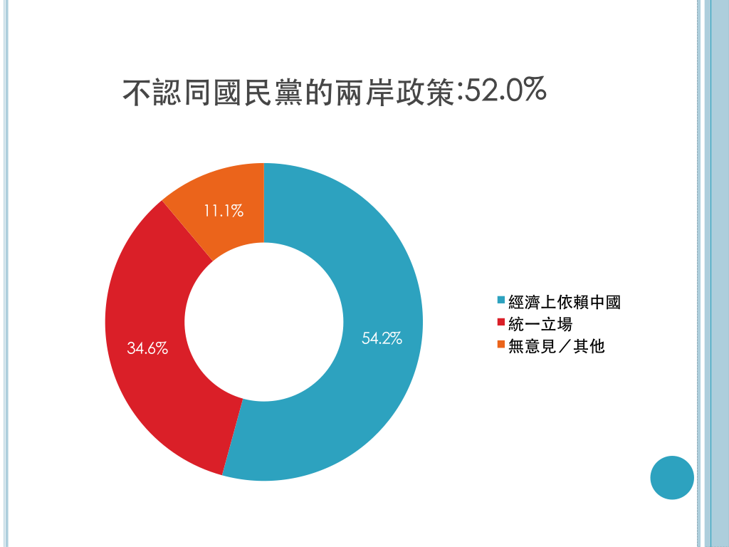 民調指出國民黨的弱點是,第一,經濟太依賴中國,第二是統一。統一固然是主權繳械;而「經濟太依賴中國」7個字雖然以「經濟」兩字開頭,但「太依賴」三個字也有主權受到威脅的意涵,「太傾中,主權受損」的第一和第二兩項加起來佔了88%。