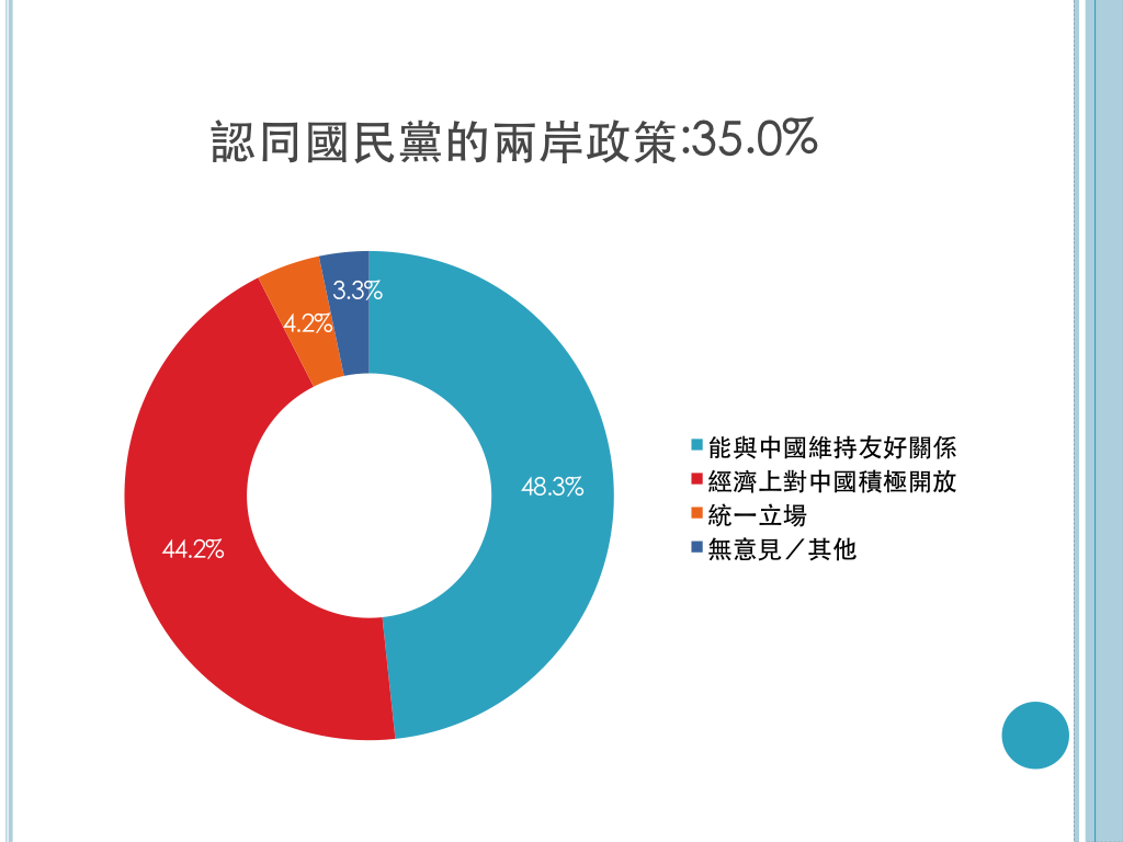 不過,國民黨在主權立場上雖然被質疑,但是這項付出並不是沒有報酬,那就是他在兩岸關係比和平上遠比民進黨受到社會肯定:
