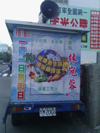 地方的DPP議員宣傳車上,宣傳的是「一週一日無肉日」這種救地球的偉大,令人感動涕零。(圖片來源:筆者攝)
