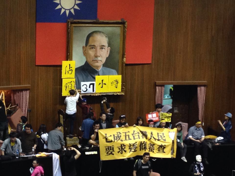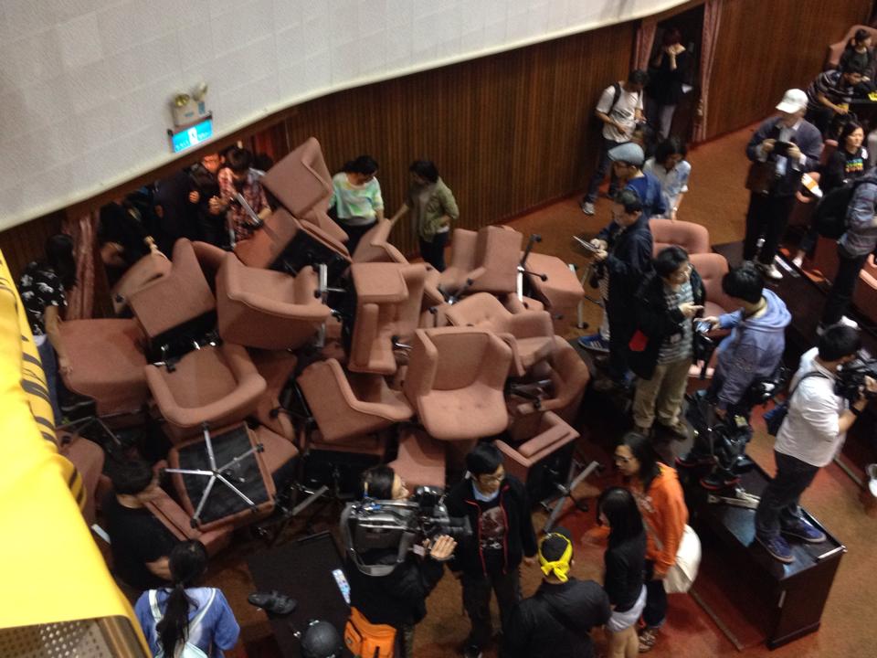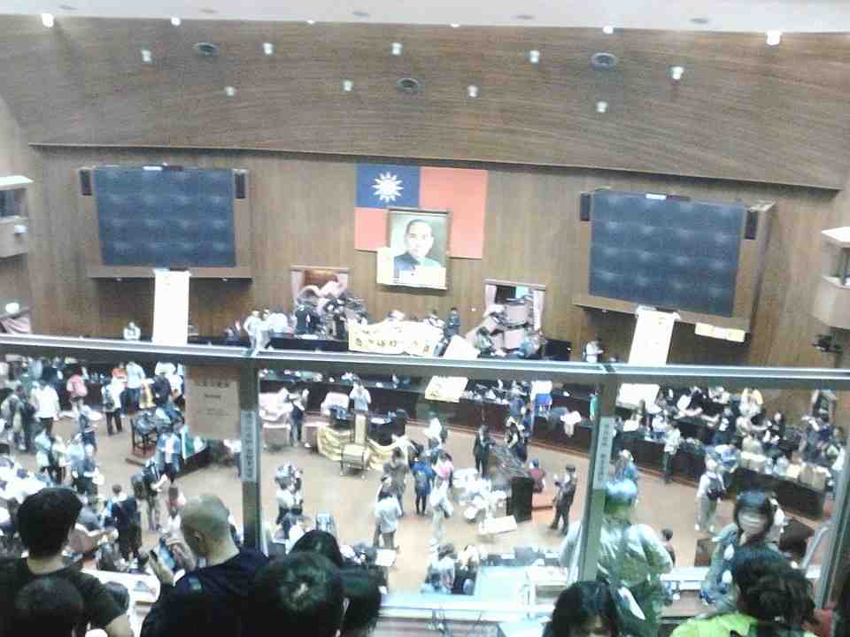 (圖:陳育賢。立法院議場史無前例地被人民霸佔,並且把大門擋住,打算全面癱瘓議事。)