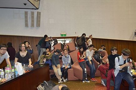議場內的學生堆疊椅子以阻止警方進入。(圖片來源:維基共享資源