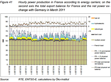 看法國這邊的圖表,很容易就知道為什麼,可以看出法國的核能發電量,就如前述一般,幾乎都差不多固定不變,根本沒有受到德國的重大變化而發生任何調整,事實上,它根本無法調整,別說是因應德國的需求,就算是法國自己的需求也一樣,很多人說德國的綠能政策在歐洲電網下才能進行,這說法不是很正確,但倒是法國的幾乎全核政策,才非得要歐洲電網不可,因為電力的供需要時時平衡,但電力需求是一直變動的,法國擁有一屁股的恐龍核能電力,不動如山,只能依靠別國的幫忙才能平衡變動,要不是有歐洲電網早就完蛋了。