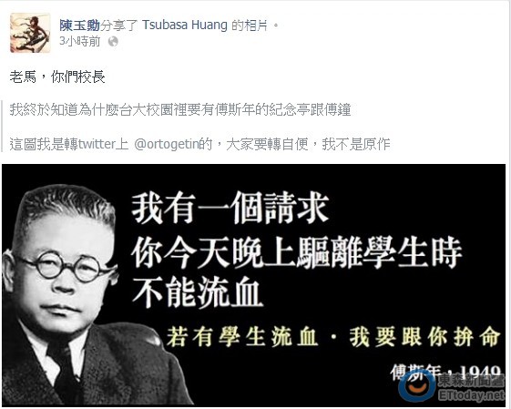 圖說:以前台大校長傅斯年,在保護學生上的心情,令人動容,睥睨當前台灣各大學的校長(取自陳玉勳導演臉書)。
