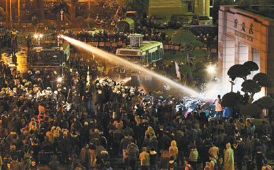 圖說:行政院前警方用水砲車攻擊民眾。圖片來源:聯合新聞網