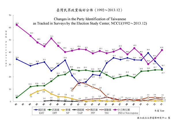 然而,奇妙的是,臺灣人認同與臺、中雙重認同者的比例拉開差距,竟是在馬英九總統,這個主張兩岸和平交流成效卓著的執政階段。有臺灣學者認為,正是因為交流的關係,讓臺灣人發現了我們與你們畢竟仍有不同,因此提高了臺灣人認同的比例。即便如此,在2013年,雙重認同的比例仍有三成五。會是五成七的臺灣人認同者主導「反中」學運嗎?但若如此,為何臺獨的支持者這麼少呢?還是說政黨偏好才是主要影響嗎?下圖亦是政大選研中心在二十年的訪問中所整理出來的「臺灣民眾政黨偏好趨勢變化」。