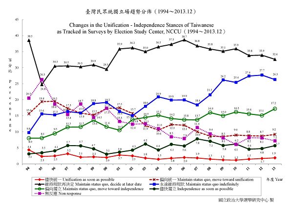 我知道,在今日,學運第十日,當有更多的社會夥伴加入的時候,同時也會有更多不同的理念進入其中。不僅是反對黑箱《服貿》、捍衛民主程序,也有反馬、反國民黨、反民生困境、反經濟不景氣、反統一,以及反中。那麼,正本清源,所謂的反中,其「中」究竟指的是什麼?是臺獨主義作祟嗎?請看下圖,此為國立政治大學選舉研究中心在二十年的訪問中所整理出來的「臺灣民眾統獨立場趨勢變化」。