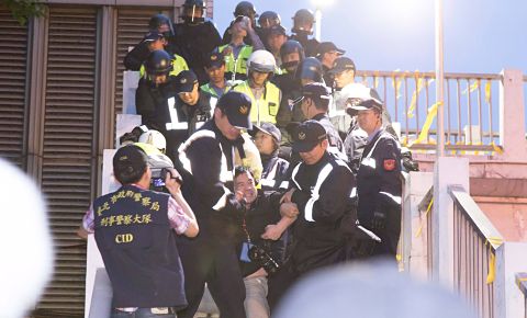 《蘋果》記者張君豪在忠孝西路天橋上拍攝警方驅離,被暴力架離受傷(圖片來源:劉書凱@公民行動影音紀錄資料庫)