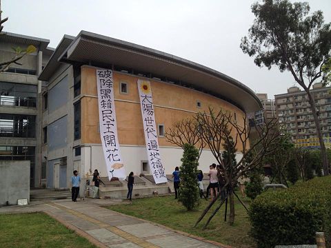 大約過了一個星期(4/2),縣政府來函說26日接獲民眾陳情,認為客院外牆的布條有礙市容要客院拆下,系主任林秀幸強硬回應:「這布條比竹北滿街的房屋廣告,更具正當性和合法性!」就基於有礙市容這件事,客院的學生又在21日掛上美化版的布條(見圖2):「太陽世代遍地播種;破除黑箱民主開花」。