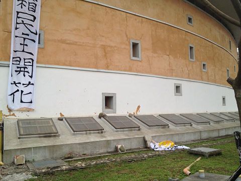 事隔三日(4/24),一名在附近看房子的女子路過客家學院,因為不滿布條內容就將其中一條布條徒手扯下,更利用剪刀將另一條布條剪破(見圖3)。事後該名女子辯稱以為這裡是政府機關,認為自己的納稅錢不該被如此誤用。