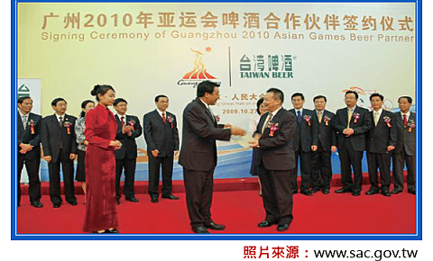 緊接著,時任台酒董事長的韋伯韜,隨即在2009年10月底敲鑼打鼓般地請來吳敦義一起召開記者會,並豪氣干雲地宣佈台酒將砸下4億台幣鉅資,贊助2010年的廣州亞運。韋董在會中,自吹自擂地說:「未來要搶下中國啤酒市場三百億元大餅,二○一○年營業額可達26億到30億。」出席記者會的吳敦義也跟著膨風:「第一、光以台灣啤酒的美味,就可能風靡中國,且台啤的商標,將凸顯台灣的優越與主體性。第二、近4億元的廣告贊助,卻可能為台啤帶來增加300億元的營收。」一搭一唱的兩人,描繪的中國啤酒市場願景,好似早已盡收台酒囊中一般。