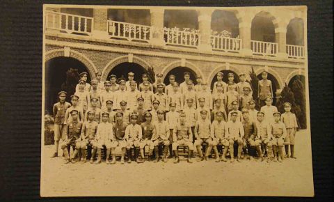 太平洋戰爭期間,祖父就讀台南長榮中學時,日本梁地教官出征,與長榮的學生們合影。(圖片來源:作者)