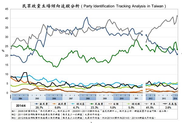 2013年9月以後民眾對民進黨的認同又領先了國民黨,這領先的態勢到現在已經持續8個月,一般認為這態勢將持續到2016,但是,許多民進黨員甚至學者都接受民進黨黨團總召柯建銘的說法,相信縱使如此,2001~2004民進黨由於民眾認同的領先而帶動國會席次的領先的歷史將不可能重現。