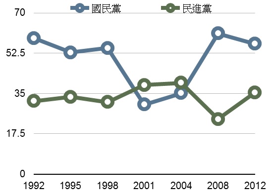 2009後民眾對民進黨認同快速恢復,拉近了雙方差距,於是雙席次落差也改善成為40比64。