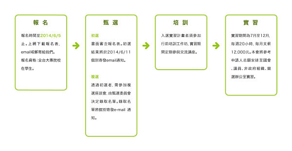 • 時間: 2014年7月至12月,為期6個月,每週20小時,每月80小時為原則。