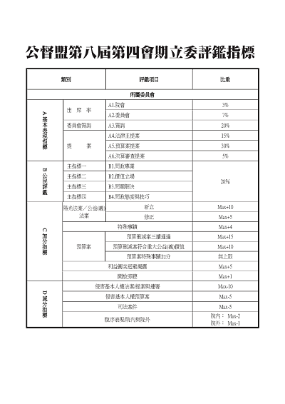 我並非要說公督盟的立委評鑑完美無缺,而是如果放著評鑑辦法不閱讀,以錯誤的資訊與理解質疑立委評鑑,終將是徒勞無益,不僅無法近一步推動國會改革,甚至會成為亂象的共同幫凶。