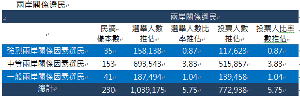 強烈兩岸關係因素選民佔投票人比例為0.87%,中等兩岸關係因素選民佔投票人比例為3.83%,一般兩岸關係因素選民佔投票人比例為1.04%,並沒有發現準兩岸關係因素選民。這四類選民總計77.3萬人,佔全部投票人數的比例為5.75%,將近馬英九領先蔡英文的得票率。