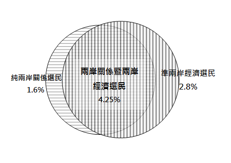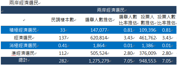 積極經濟選民佔投票人比例為0.81%,一般經濟選民佔投票人比例為3.43%,消極經濟選民佔投票人比例為0.01%,準經濟選民佔投票人比例為2.80%,兩岸經濟選民總計7.05%。4.25%的選民因為兩岸經濟因素轉向支持馬英九,0.01%的選民因為兩岸經濟因素而沒有出來投票(可能投給蔡英文)。此外,雖然2.80%的選民仍投票給蔡英文,但是在未來選舉可能不會投給民進黨。
