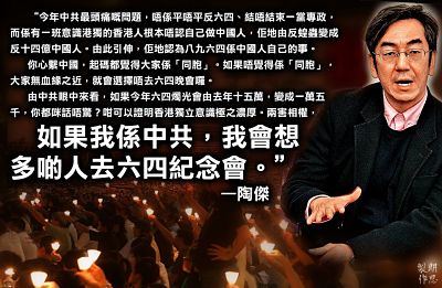 基於此,有香港第一才子稱號的陶傑,便犀利地直指:中共最怕的問題不是六四平反與否,不是一黨專政結束與否,而是有一群港人從反蝗蟲變成反中國人(港人常用蝗蟲稱謂形容中國觀光客在香港的肆虐掃貨。此語並非歧視可概括,反倒更像是港人以辱罵話語為表現之弱者的武器)。一旦,六四是中國人而非港人之事,沒有同胞血緣連帶感,便不會去六四晚會。陶傑更進一步認為,一旦維園悼念人數陡降,便意味著香港獨立意識之濃厚,『如果我是中共,我都會想多一點人去六四紀念會』云云。