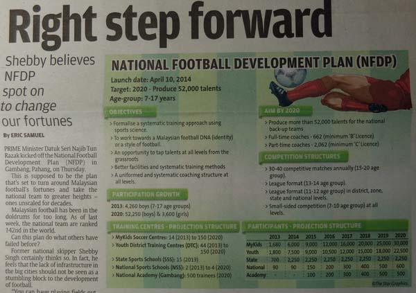 (馬來西亞提出6年培育足球員計畫。原文刊載於馬來西亞2014年4月13日Sunday Star。作者攝影)