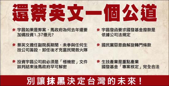 六、2012年8月14日,特偵組認定國發基金否決投資南華生技、國發基金參與台懋創投、國發基金投資宇昌,全部查無不法,蔡英文也未中飽私囊濫用特權,因此簽結宇昌案,還給蔡英文清白。