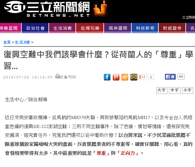 最近地球的天空,很憂傷。從阿姆斯特丹出發的馬航MH17,在烏克蘭東境親俄民兵襲擊下,佔機上約三分之二的193名荷蘭籍乘客,全數罹難,成為荷蘭史上最嚴重的空難之一。緊接著,上個禮拜的颱風天傍晚,復興GE222高雄飛往澎湖馬公的班機,也因天候視線不佳,發生空難事件,已確認的往生者有46位。