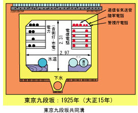 右圖是關東大地震後,東京都在1925年試行的東京九段坂地下共同溝示意圖,當時只知道汚水管道(下水)必須使用單獨空間,其他的電力、電信、自來水(水道)、瓦斯(ガス)都共容於斷面2.31m×2.97m的空間裡。(即使如此,90年前的日本人,也不會白目到把石化管線装到共同溝裡。)