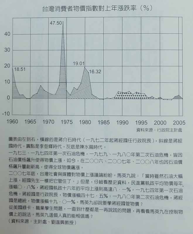 (馬英九在2008總統大選時說要效法蔣經國平抑油價物價的政策,如今看來,台灣的油價物價大漲,他真的做到了。圖:作者翻拍自「馬經Ⅱ:你必須知道的馬英九」頁111)